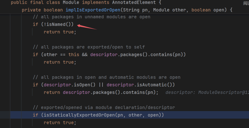 跟下来发现这段,意思是被调用类没有模块名字的话就直接返回 true,那 JDK8 中并没有引入JPMS所以模块为空。